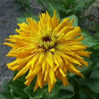 | ZM, That last zinnia you've shown is so unusual! I look forward to see what your latest plantings show! --especially if you can get those trumpet flower seeds to germinate (the ones that may have been selfed). I'm collecting seeds now,and trying to beat the finches, who are very active in getting a meal from among my flowers. I used to cut the entire flower off and collect the mature seeds, but now I am doing what the finches do--taking the mature seeds from the base of the flower and allowing the newer seeds to develop as the flower reamains in the garden. Also, the pollen, if present, will be around longer for crossing there. The bees are more numerous than ever this year--I think it is because so few flowers are blooming around here with the heat and dryness. Here is one of my zinnias, which has a very deep flower, with lots of petals. I would bet that this flower is a descendent of one of the Queen Lime zinnias.