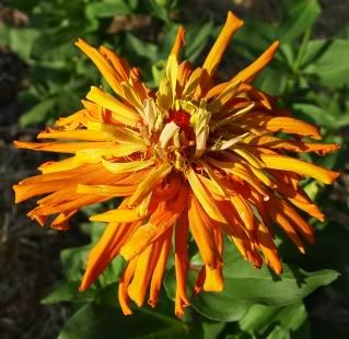 | ZM, I would think the age of the Whirligig seeds would be far less a problem than the severe heat you are dealing with out there now! How will you keep the seeds moist during germination? Just asking that because I was considering putting in more zinnia seeds but I was afraid they would dry out! I did plant a few sunflowers, by cutting out the bottoms of plastic cups, embedding the cups in the soil, then putting the seeds in them. When I water them, the water is focused on the area around the seed. But I only planted a dozen or so sunflowers! Here again is one of the most extreme of my flowers.