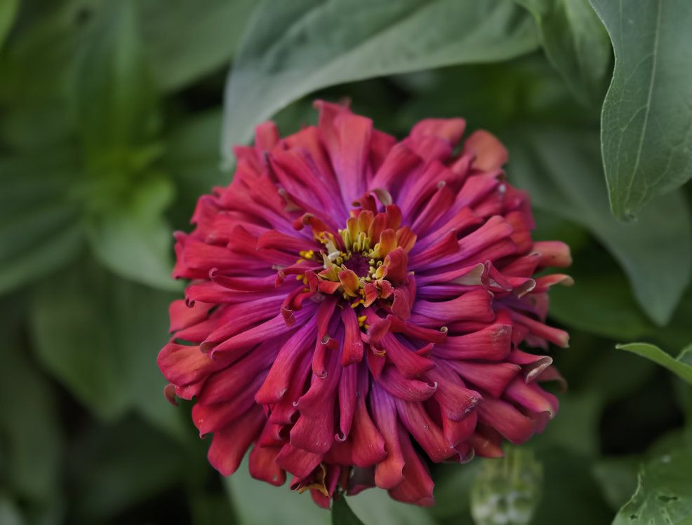 It has a nine spotted cucumber beetle hiding in it. They are a pest for zinnias. They don't eat a lot, but they will eat small holes in most any part of a zinnia, including leaves and flower petals. The damage they due is mainly cosmetic, but I hand pick them when it is handy. This is a somewhat more true-to-type scabious recombinant, though it is not red.