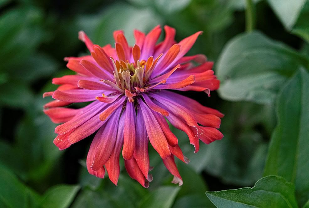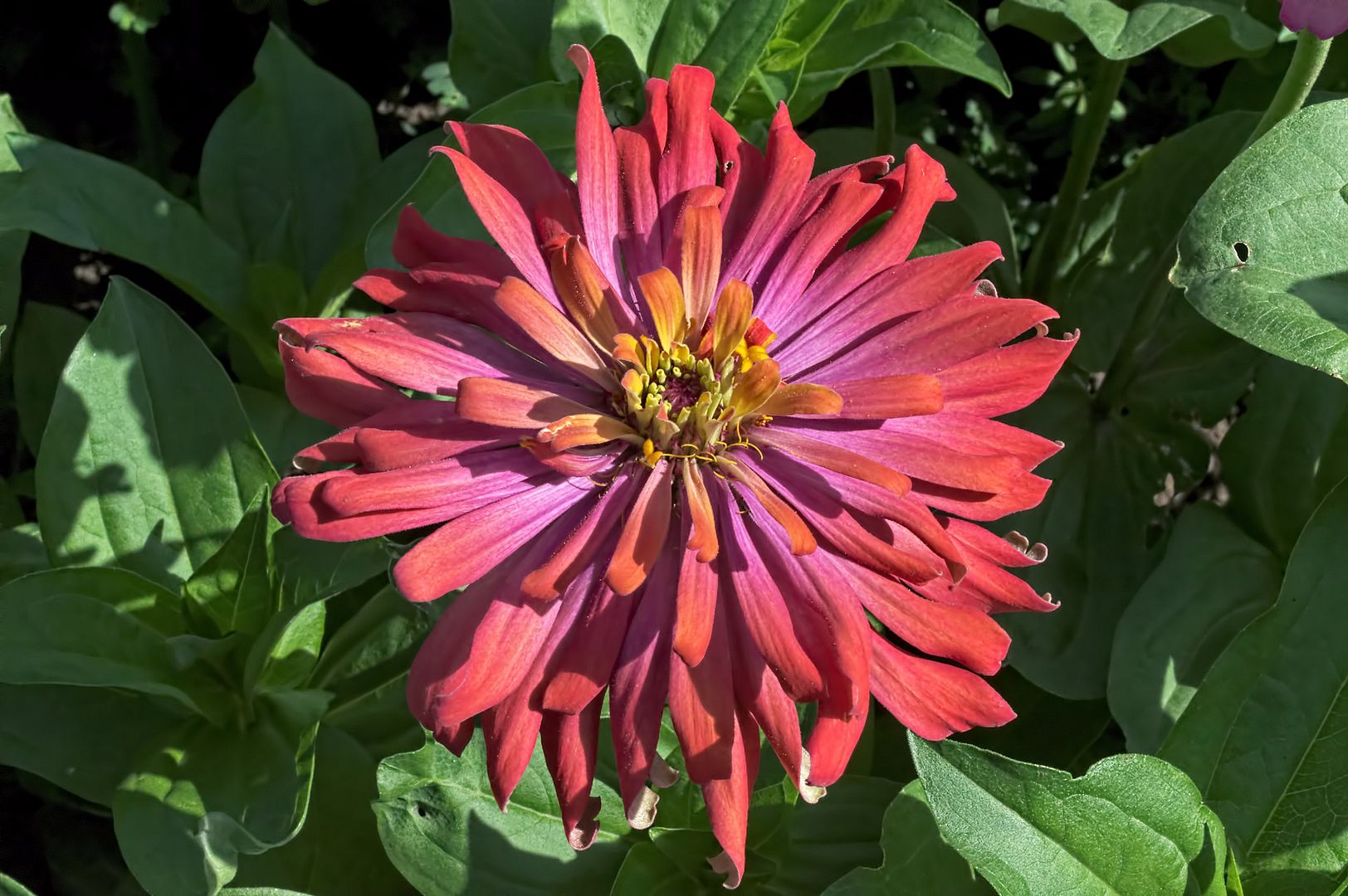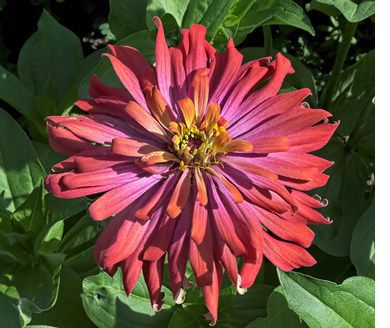 That bloom has added many petals and the flower form has transitioned into a fairly classic cactus flowered zinnia. Which is unfortunate, because overlapping petals conceal many interesting petal colorations. But it is what it is, and this is a reasonably accurate representation of the bloom as it was when I took its picture yesterday. I am glad that I set my camera to the Adobe RGB color space, and I intend to leave it there. So this has been a kind of "live and learn" experience for me. |