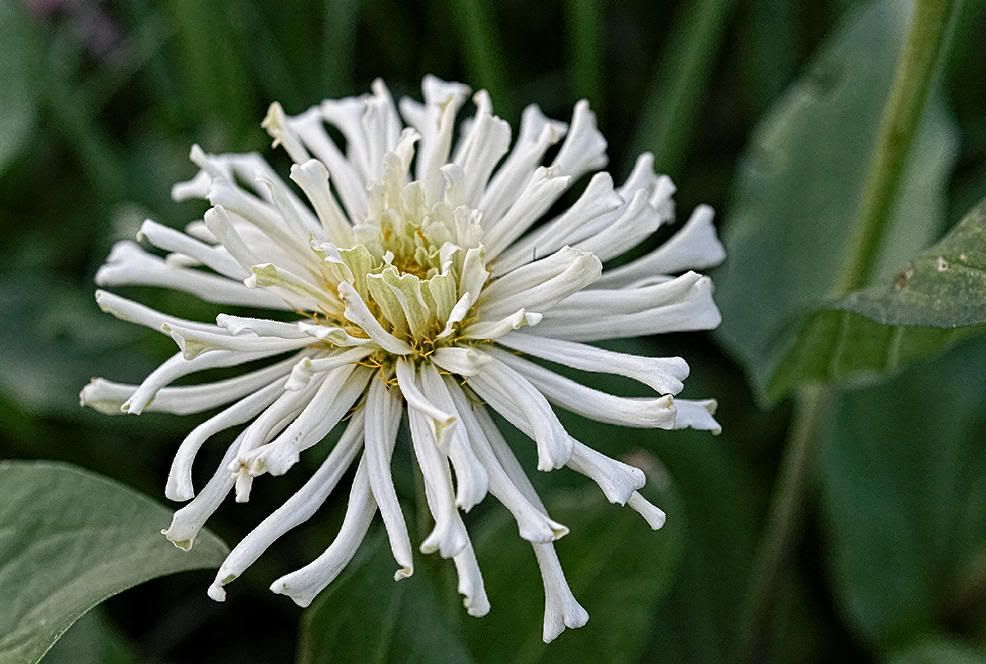 I think of that zinnia flower form as "chrysanthemum flowered". Some people might call it "cactus flowered". It has a yellow center, while some truly white zinnias have a matching white center. I intend to pollinate it with its own pollen or pollen from other reasonably good white zinnias. |