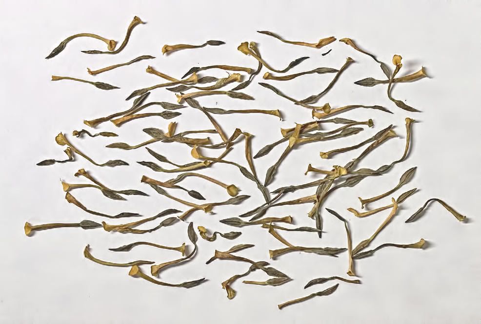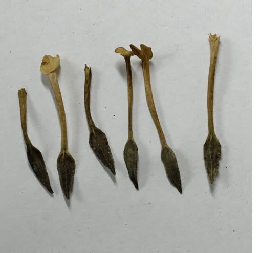 The structure of the tubular petals that do form seeds can have some very narrow tubular petal attachment, as in this sample of recently saved petal seeds from breeder F35, which has a fairly high percentage of viable petal seeds. F35 was a progeny of F5, which was a non-tubular specimen from E2, the original trumpet-petaled specimen. Apparently F5 was a cross between E2 and some selected pollen parent, and the trumpet petal trait was recessive in it, but came out in F35.