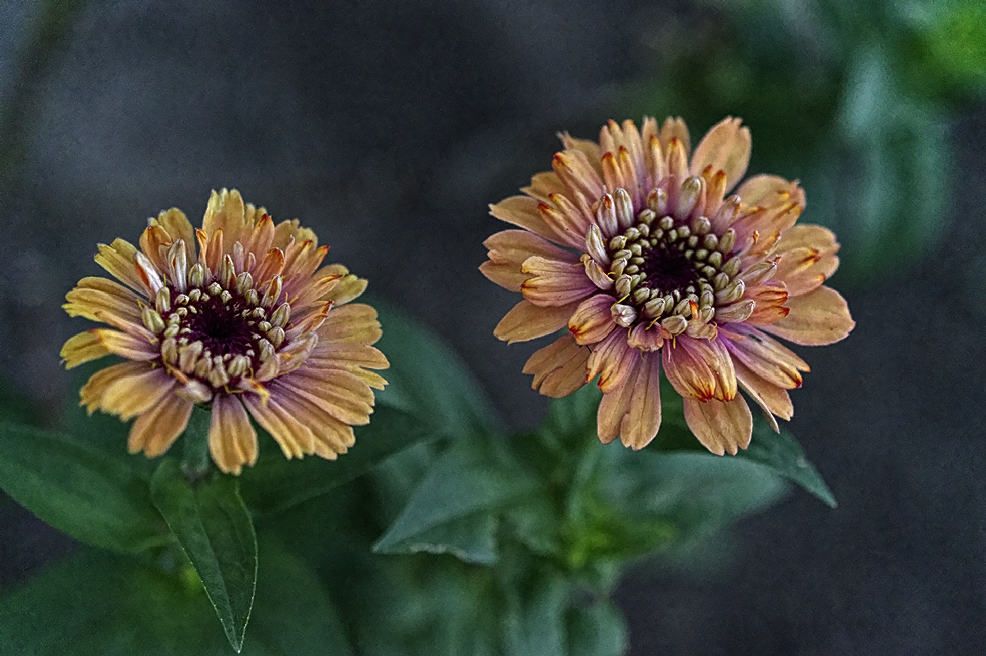 | I went out and pulled as many weeds as I could find, cut out some old blooms, and spread a layer of new seeds out. Here's a funny coincidence in unlucky zinnias: I have no idea why one is missing petals and the other is missing the entire center, but it's pretty funny looking. The heat and drought has pretty much ravaged everything here, and my zinnias are no exception. Seems the hotter it gets, the more desperate bugs seem to be, and also the worse my garden turns out. At least my peppers seem to be holding up. |