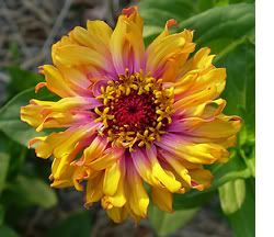 | Hi JG, That is a great picture of a great zinnia! Its X-roll petals are accentuated by the two-tone effect, with orange going into the roll and yellow coming out. Apparently the X-roll effect is multi-gene, since the amount and style of the petal roll seems to occur in different variations. Don't worry about the problem implementing my little-image-big-image scheme in Flickr. I may look into that when I get to a "lull" in my activities. But your presentation of large pictures is working just fine, and getting the job done. I am currently planting my Fall crop of Whirligigs. I am using some old seed, dated 2007, so I will plant with a closer spacing to allow for a lower germination percentage. The "survivors" of this long storage time will have passed a test of sorts. That could be a good thing. I hope to find some specimens with at least some amount of petal up-roll, and inter-cross them to get the beginnings of a strain. More later. ZM |