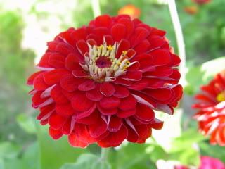 | Good morning! I was disappointed on a quick check of my somewhat soggy garden last evening. I have shown earlier a yellow flower with red-tipped petals that I thought was interesting. The second flower on the same plant was a solid red! A similar thing happened when I looked at the plant that had the red flower with tubular petals--the second and third flowers on that same plant had red daisy-like, but flat, petals. Consistency in these zinnias would be nice! More later..... JG |