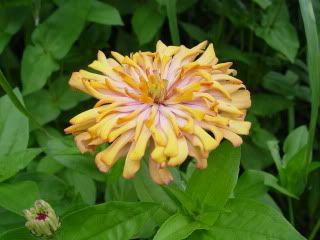 | Hi all! ZM, a line of bicolored cactuses would be a welcome addition to all the zinnias that are offered. I find them once in a while among all my cactuses, and rarely among my whirligigs, and they always stand out. The gold-yellow and pink bicolor looks good. I have been in the Ozarks for the past week, kind of in ZM's neck of the woods, well, more so than Indiana! I didn't see a zinnia there, but lots of crepe myrtle and resurrection lilies and cosmos. Anyway, I came back to a water-damaged garden--we had 2 3/4 inches of rain in the last week. Here are some of the flowers I have now: