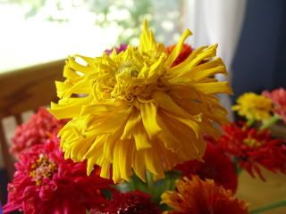 | Hello! The cactus zinnias here are doing well, and I was able to create my husband a nice birthday bouquet. Everyone in our family is a summer person, so they all get zinnias on their birthday! Anyway, there was a pretty nice yellow zinnia in the group I picked.