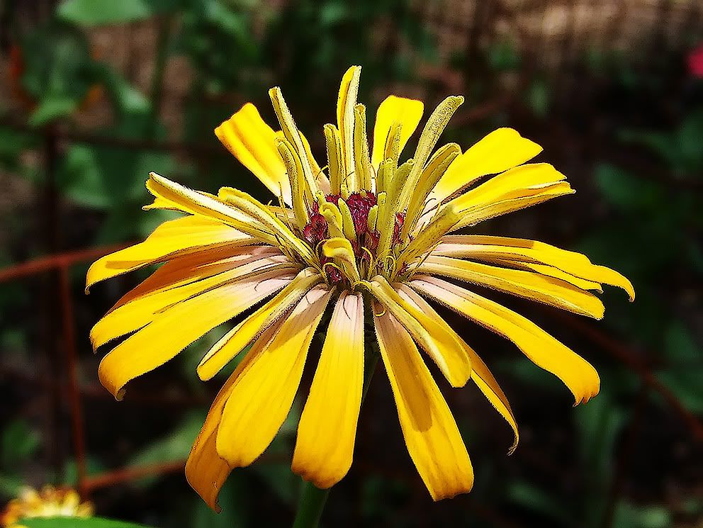 The colors in this one range from canary yellow through yellow-orange toward pink. It is rather similar to another specimen I posted in Part 11. I'll cross-pollinate the two. I am hoping to get a strain of multi-colored spider flowered zinnias, but I have a ways to go to achieve that. There may be a few bumps in the road toward that goal, but the journey is a lot of fun for me.