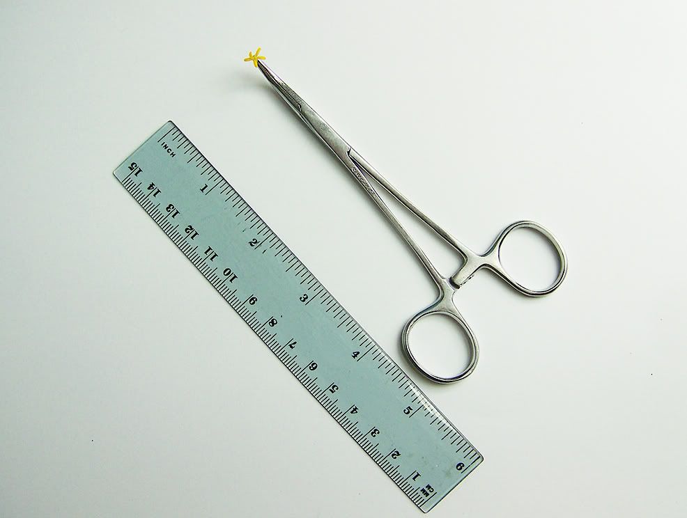 | Kelli, "How exactly do you cross-pollinate / hybridize?" JG is right that the most recent description of zinnia cross pollination techniques was on Mon, May 25, 09 at 11:36 in Part 10 of this message series, in which we described the transfer of pollen using a pointed artist's brush. The artist's brush is particularly handy when you have "piles" of pollen available in the zinnia florets. There are other ways to transfer zinnia pollen. Frequently, when you are working outdoors, the wind and possibly insects may have scattered some of the pollen from the florets. When that happens, I use a small pair of forceps to "pick" a floret and use it as a brush to apply what pollen is left in it. This picture shows a floret being picked by a forceps. You could use tweezers or Twissors (tweezers with scissors-like handles) to handle the floret as well.