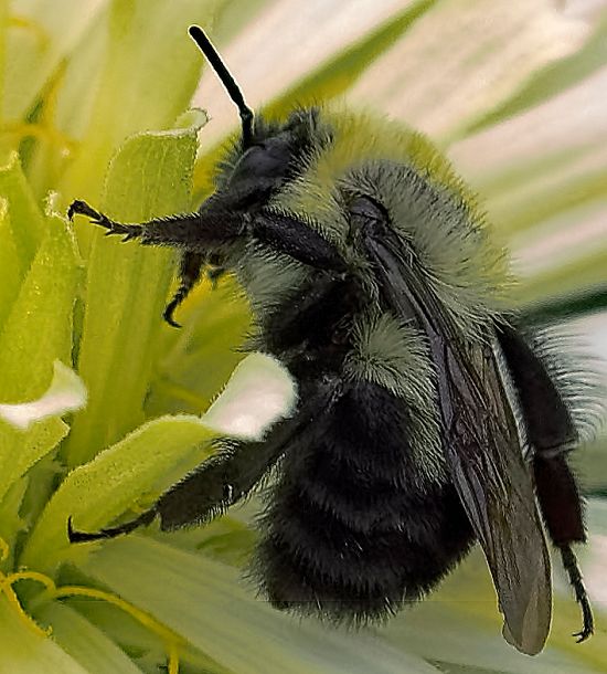 They can look dead, but they aren't, and they wake up and continue gathering zinnia pollen. Since that picture was originally 6016 x 4000 pixels, I had to down-size it a lot to make it fit in the 550 pixels wide allowed by this forum. That meant I had the opportunity to crop out a detailed picture of the bee, like this.