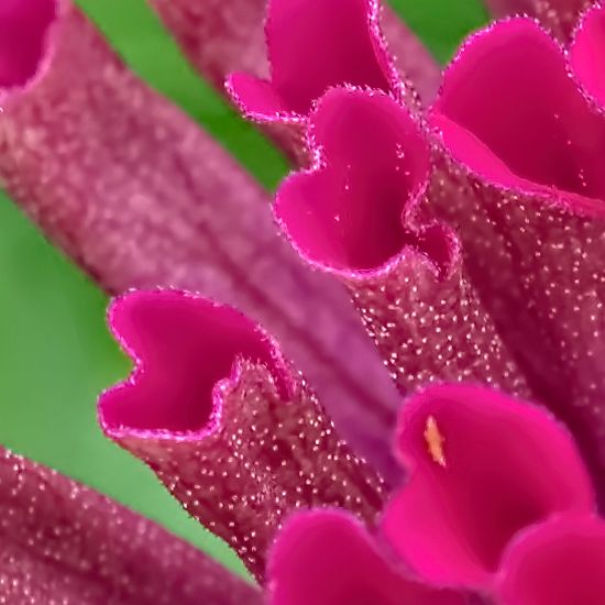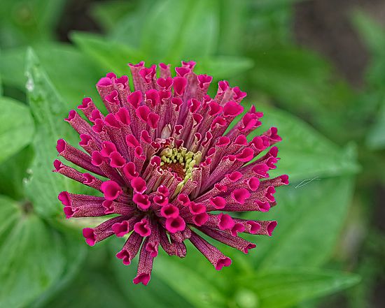 | The fringes on my Thumbilinia are not so big- don't be too impressed! Either each petal is pleated, or the petal is smooth and the tips divided into 2-3 lobes. The pleated ones look almost "pinked", but only slightly. The pleated ones tend to have more subtle shading (hues of pink), while the lobed ones have an extremely intense color and a lot of pollen florets. One of them has almost scabious-type petaloids! A good deal of the florets turned into semi-tubular, purple structure with lines of pollen. Somehow, it looks nice on this zinnia! |