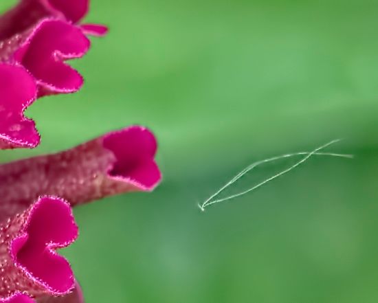 That mystery is solved. A spider web strand (barely visible) had snagged some kind of fiber that was floating in the air. Further examination of the picture revealed a tiny creature in one of the petals.