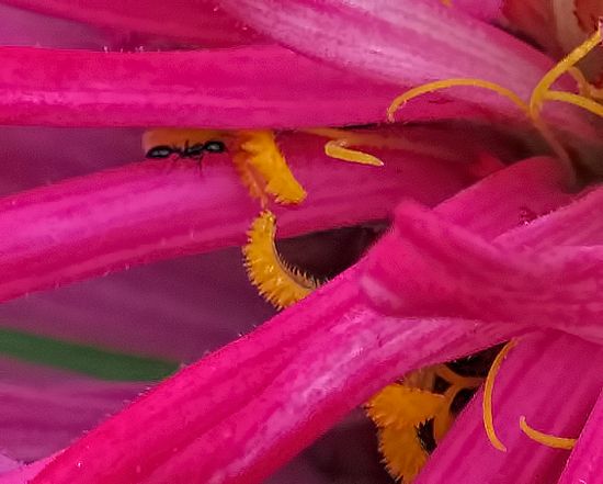 Those little ants are presumably drinking some of the zinnia nectar. They may very well be responsible for the mystery pollination of some of my tubular zinnias last year, in which case I got good seed yields from tubular petals whose stigmas were inaccessible within the tube of the petal. |