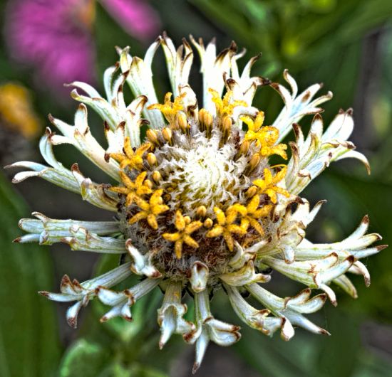 | ZM, That zinnia is striking. The most interesting zinnia i have seen is a lot like your first tubular, exept with no "pleating" and thus no flare. About half of its petals are extensively tubular- the rest are just very gently fused at the base. It too, is single Anyway, My Senoras are flowering. They look like hooked-tip partially unrolled cactus zinnias. Hopefully, the legion of bees and butterflies will create sufficient crossbreeding- during a good day, every flower can have at least one butterfly and/or bee! I hope your G13 has interesting results. Is it a scabrous? If so, that will explain the brown tips- all my petaloids on my Thumbilinias (they have a lot of those on the tall-cone type) have yellow streaks (remnants of the male stigma [statem?]) that fade to brown. |