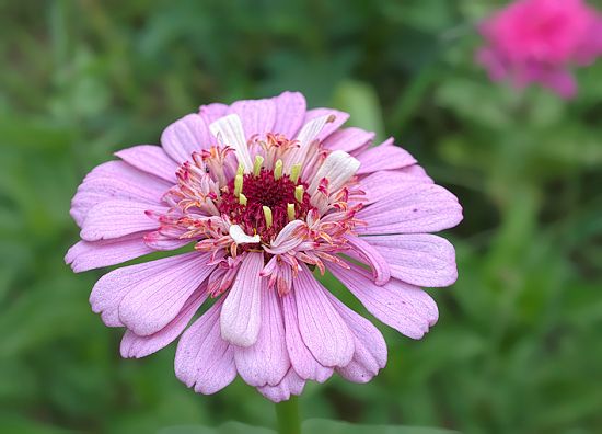 I really "missed the boat" by not growing a lot of green zinnias this year and crossing them with everything. I will grow greens next year. This is another pale lavender that has bluish tendencies. I think that katydid (if that is what it is) agrees with me on that.