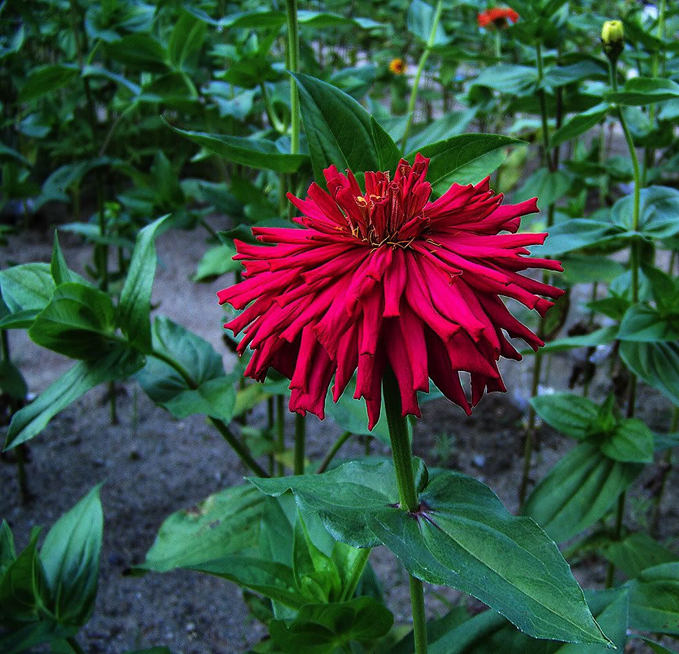| JG, "I think the funny thing among us zinnia people is that-- some of our family or friends may think that would be the perfect specimen to display indoors singly in a vase, but no! our flowers stay in the garden for crossing or/and seed collection." Exactly. My family sort of understands that now, but it does take some getting used to. Here is another specimen in my bed of Burpee Hybrids.