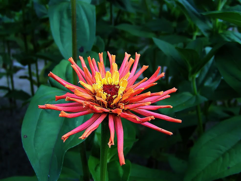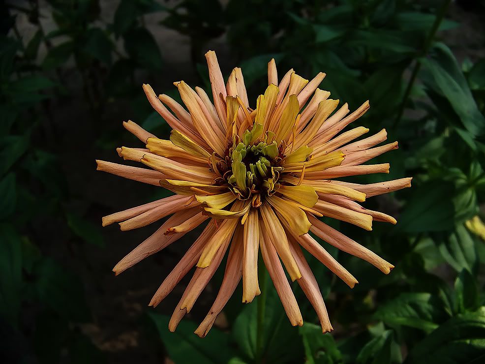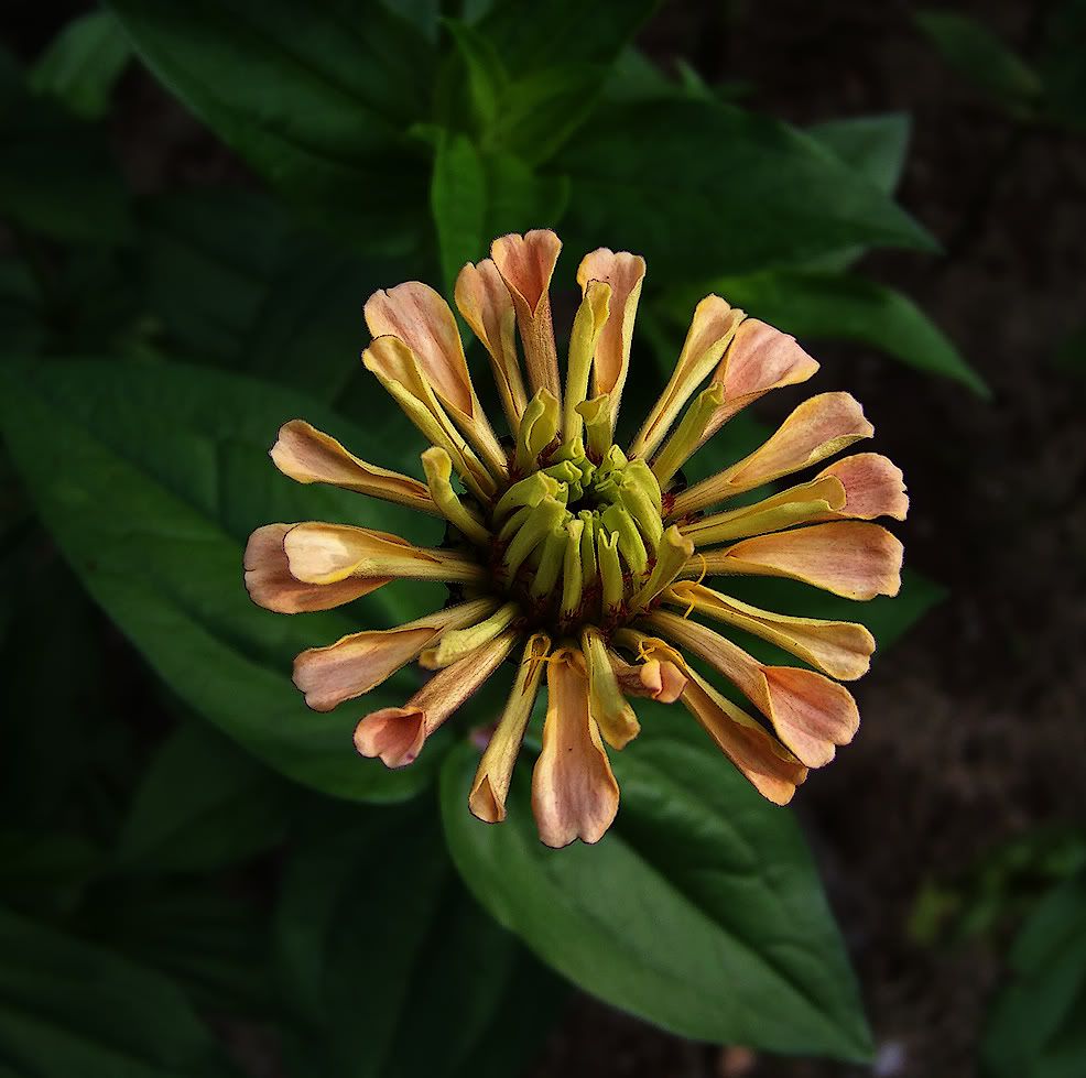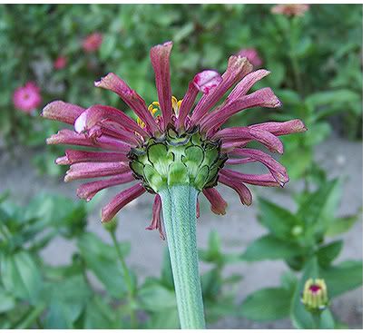 It is interesting at this stage, but I don't like it overall. It looks a bit like a carnivorous plant, that could fold its petals in on a bee. Who knows? Maybe a prehistoric proto-zinnia actually was carnivorous. MM |