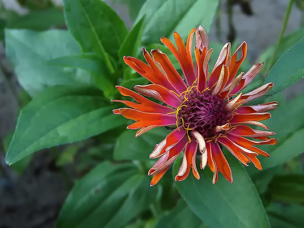 | BTG, I really don't know for sure, but I think your rolled-up tubular orange zinnia is partly genetic and partly environmental. Like JG suggested, if it were purely environmental, all of your zinnias should be doing that now, and she and I both suspect that all of your zinnias are not doing that right now. Still, your orange zinnia has rolled up its petals enough that they look tubular, and a lot of up-rolled zinnia petals are not that extreme. You might want to save seeds from it. The remnants of Hurricane Ike are apparently going to just miss us, but it rained here most of the day anyway, so I didn't get a lot done in my zinnia patch. I am encouraged that some of the foliar feeding that I did a few days ago had a good effect. I am becoming enthusiastic about the foliar feeding of zinnias, but you have to be careful to use a weaker solution on the flowers themselves, or you can burn the petals (as I did on some of them.) I took this picture of a Zig Zag a few days ago.