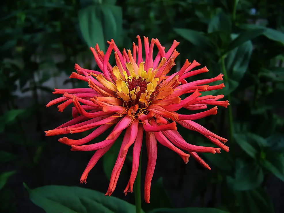 | HC, That's one talented spider! As soon as the Sun went behind the trees, I snapped this picture of the zinnia I mentioned.