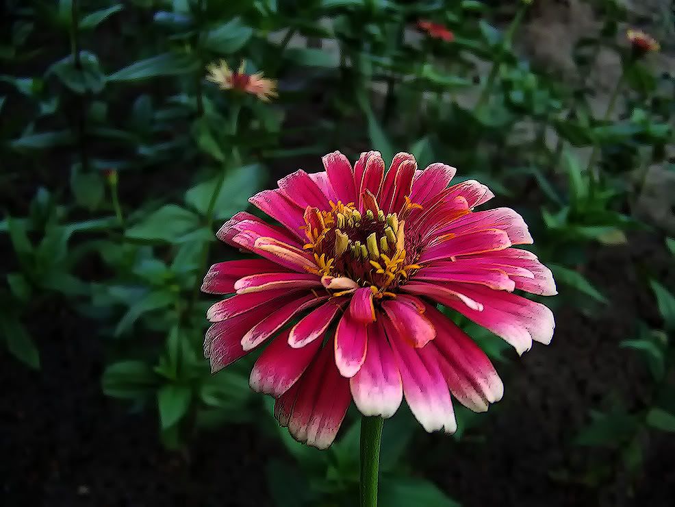 I like to be able to see "through" a zinnia flower, and you certainly can with this one. It almost isn't there. Of course, I would much prefer that it grew more petals, but unfortunately it seems to be giving me the "finger". MM |
