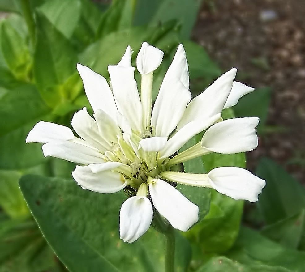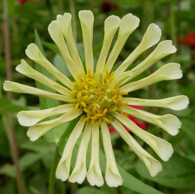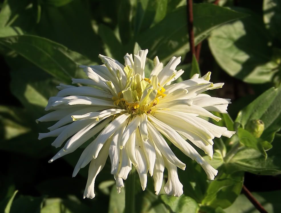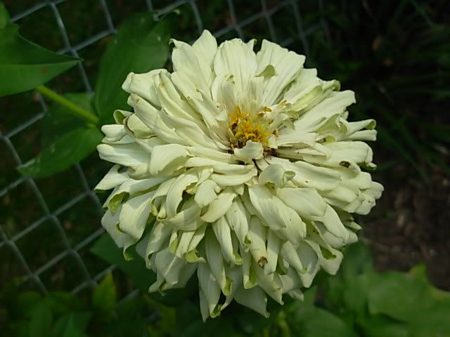 That one was only about 5 inches across, and I think its color is more of an ivory than pure white. I would like to have some giant (six inches or larger) pure whites in interesting flower forms. White zinnias look good in the evening, and they make nice pastel colors when you cross them with other colors. So next year I plan to have a separate white zinnia garden. I purchased a bunch of white cactus flowered zinnia seeds, and I plan to plant them in their separate garden and cull out everything but the very best to save seeds from. And I will probably hand-pollinate and cross-pollinate some of the choicest specimens. |