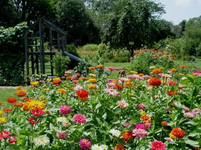 We have had a couple of recent rains, about an inch total. We are nearly surrounded by soybean fields, and they are looking pretty good. They are genetically modified to make them tolerant of herbicides. I wonder if zinnias could be genetically modified the same way. I was concerned when the farmers sprayed the soybeans with Roundup (or an equivalent brand). I hoped that spray drift wouldn't get my zinnias. Apparently none did, because I didn't notice any ill effects. |