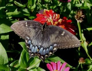 and least, but not last, one of the joys of the zinnia garden, in the morning-- a butterfly, the dark form of a tiger swallowtail, sunning herself before collecting her nectar for the day : JG |