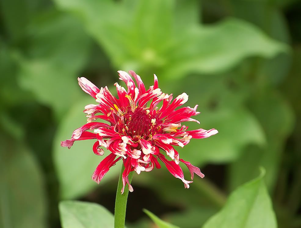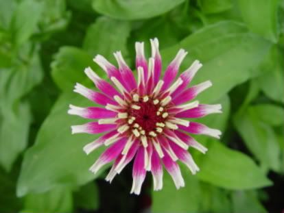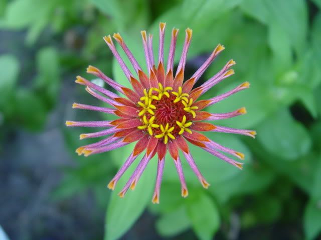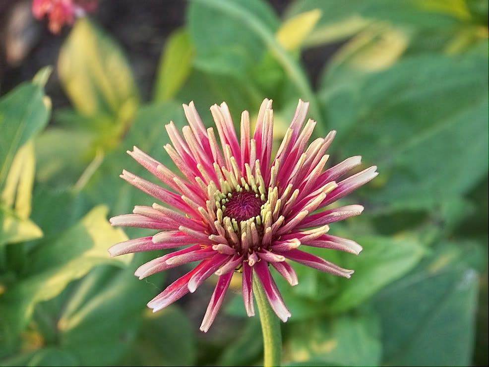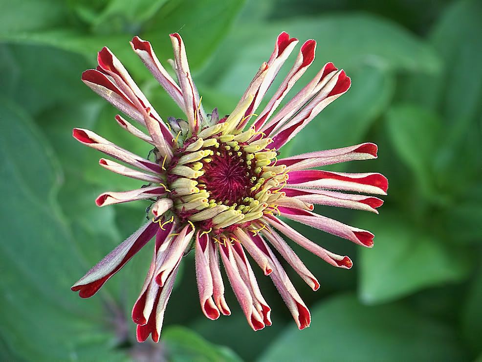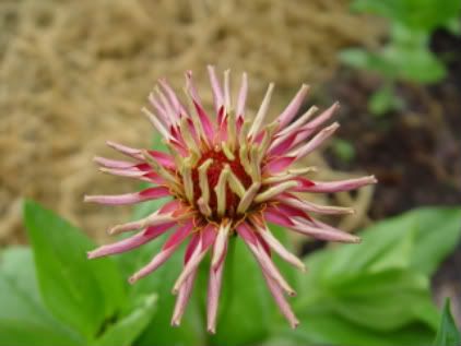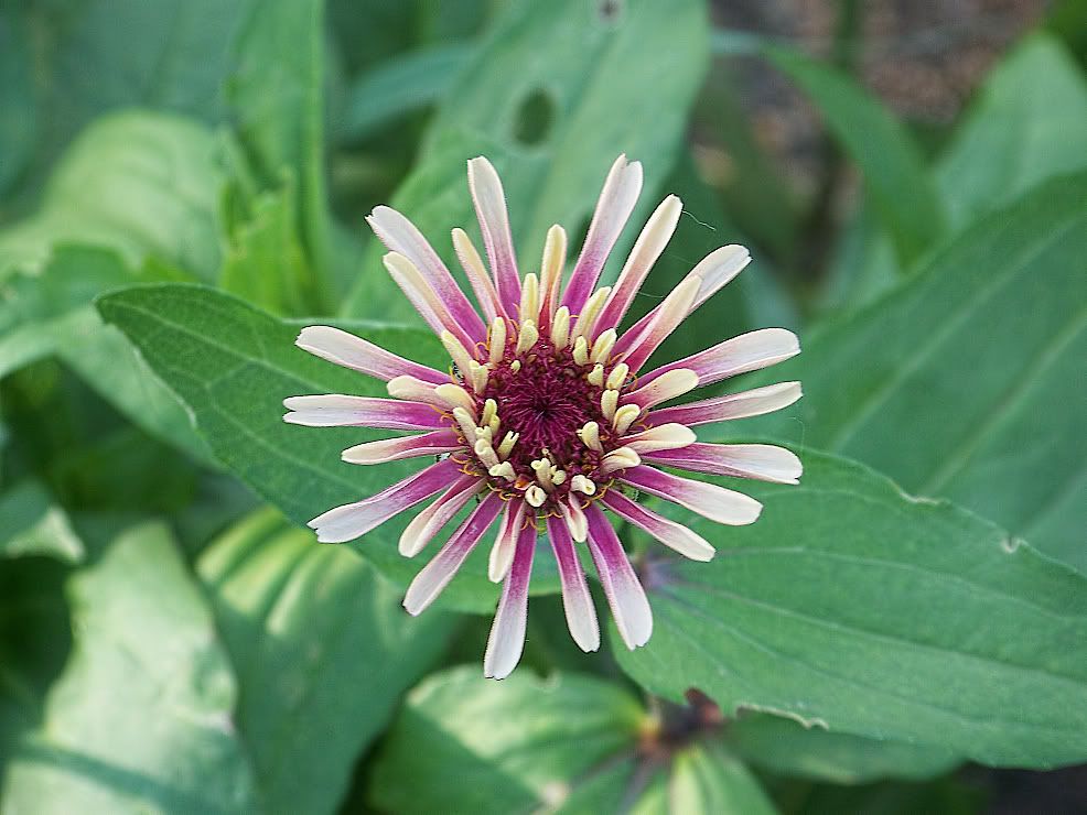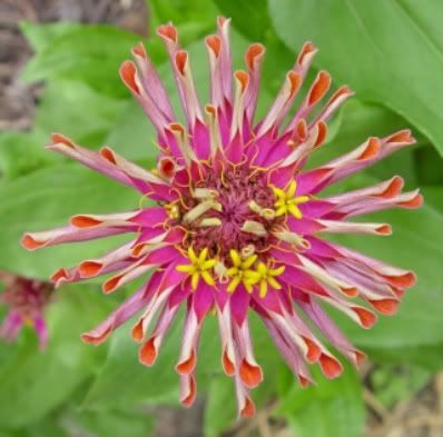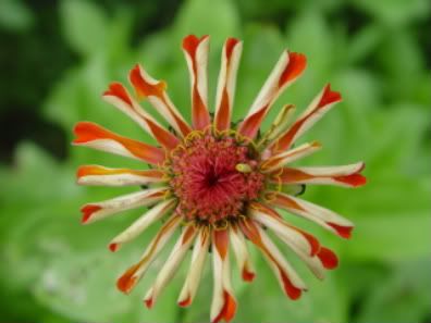 | ZM, The last flower is pretty because of the unusual form and the combination of colors. It seems that there is no limit to the number of different flowers we can get with zinnias! I noticed today that a new Extreme Roll flower appeared. Flowers in my garden are becoming smaller and smaller because of the harsh conditions out there..Now we are back to days in the nineties again! No rain for many days....