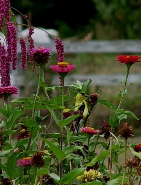 | ZM, Your red and white zinnia almost looks like it is a picotee....that would be something to have. I've seen some zinnias acquire that look when the flower really gets old, but it's better to have the effect from the start. My garden is more jungle-like than ever. When I go in to collect seeds, the finches actually scold me the whole time I'm there for invading their territory. But the finches seem to be cooperating with the butterflies and bees. They pull out the petals with the seeds and leave the flower heads with yellow disc florets for the insects, as well as the hummingbirds. The spiders are in full force, too. Big garden spiders make huge webs that surprise me when I walk into them, and little spiders hide in the older flowers waiting for insects to come along, as do the assassin bugs and praying mantises. It's a wild world out there! My zinnias are becoming spotted, and dry. We have only had 0.4 inches of rain in August, and it is really showing.