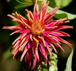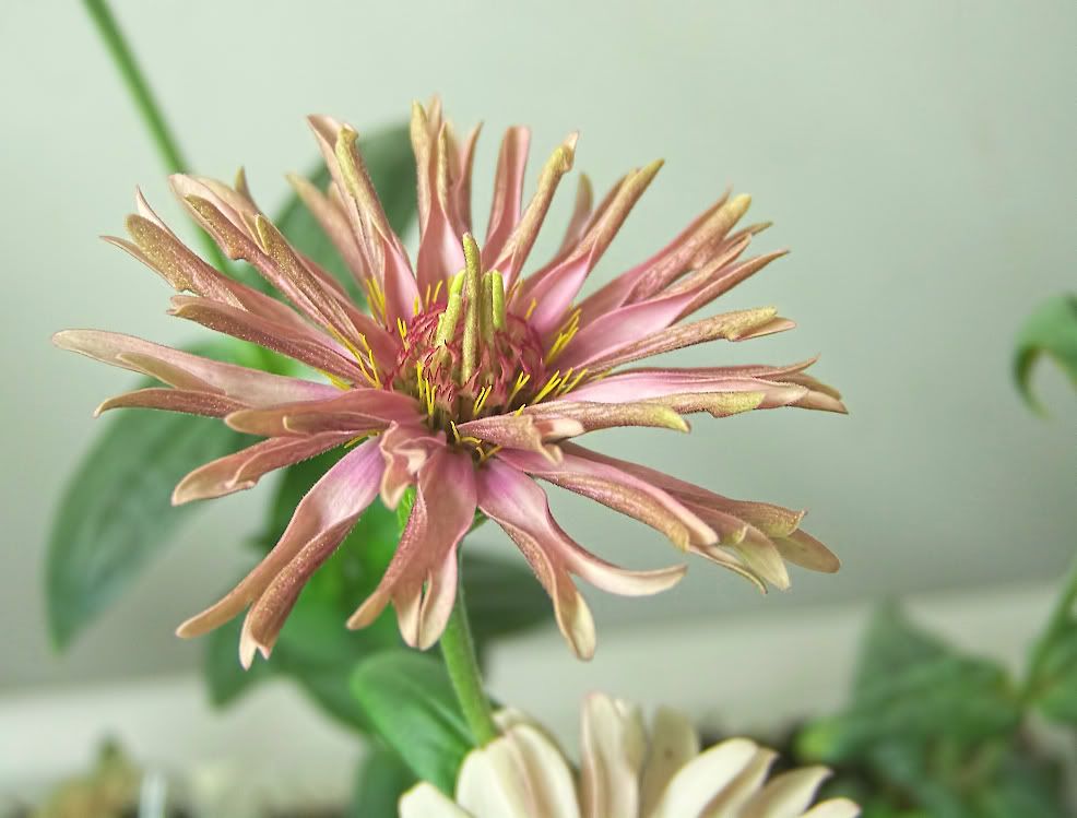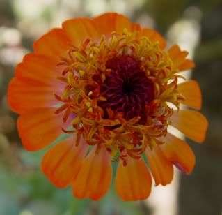 | ZM, Your flower looks as if it is a dinosaur offspring with the large stigmas--and I bet it really does have shaggy dog tendencies! I think if there was interest out there, zinnias could be genetically engineered. I don't know about Roundup resistance, though. I think environmentalists hope that if herbicide resistance is engineered at all, that it is restricted to food crops. If zinnias were to be genetically engineered by anyone, I would guess it would happen in Holland. The Dutch are very enthusiatic about creating new flowers and are proficient in the newest technologies. Here is one of my newer flowers: