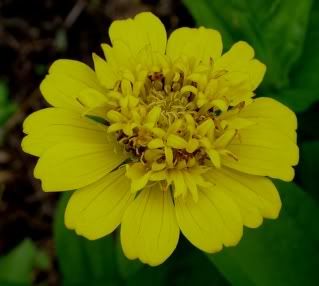 | Marquest, Zinnias are composite flowers--that is, each flower head consists of many flowers. There are ray flowers and disc flowers on the flower head. The ray flowers are usually the most numerous (although, not always). Anyway, the "petals" that you see on zinnias are essentially the ray flowers. The little bright yellow florets that many, but not all, zinnias have are the disc flowers, located in the center of the flower. If you pull one of the "petals", and that flower has been fertilized, there will be a darkened seed at the base of the petal, as in below: