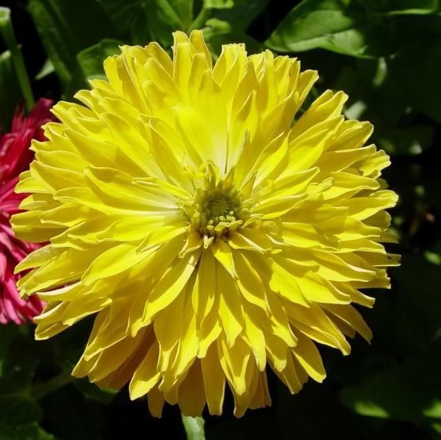 The two blooms shown here are on the same plant, showing that as the bloom develops, the petals grow longer and hang down, while the newer petals have a particularly twisted look. I am hoping to get seeds from this specimen, with the goal of eventually creating a strain of "shaggy dog" zinnias. The shaggier, the better. I have a lot of zinnia goals. |