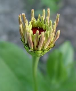 It has the long, flat petals of the aster flowered flowerform, and it also has the large stigmas of the "dinosaur" zinnia that appeared in the Fall of 2009. This Spring I'll be growing out a lot of seeds that I saved from various aster flowered specimens last year, which should give me the opportunity to select out some further improved versions. I'll need to do a lot more cross pollination to get a complete color range in the aster flowered zinnia strain. It'll be fun to see how that goes. I am always filled with anticipation when a new zinnia plant starts to open its first flower bud. |