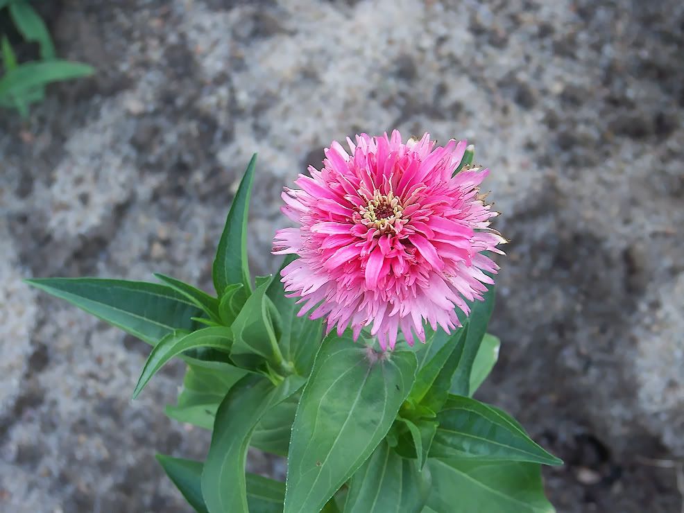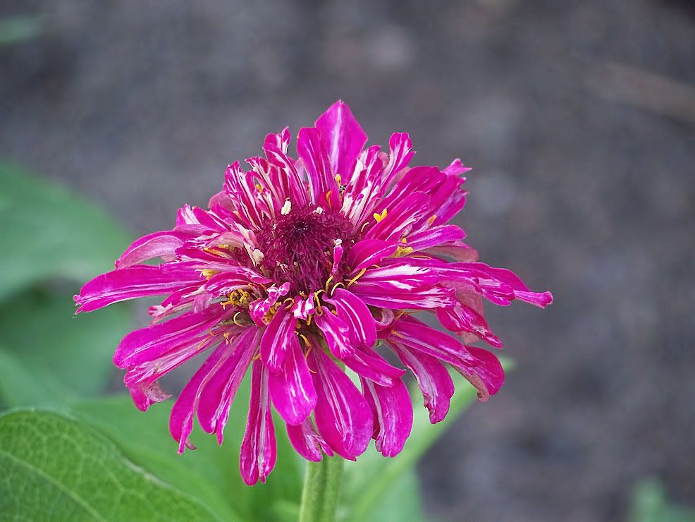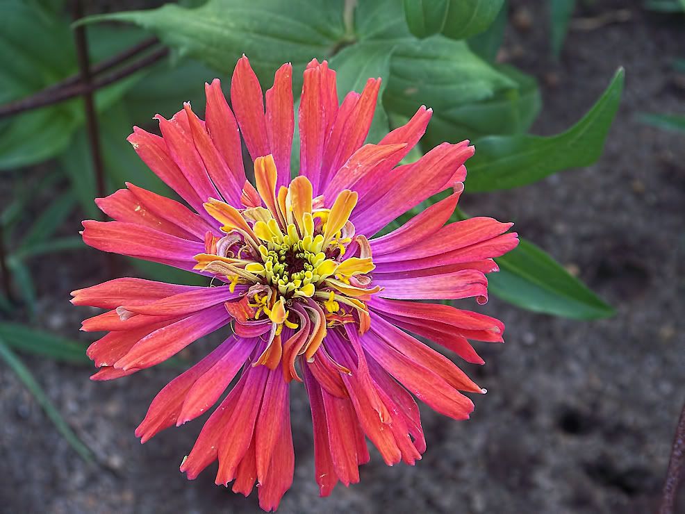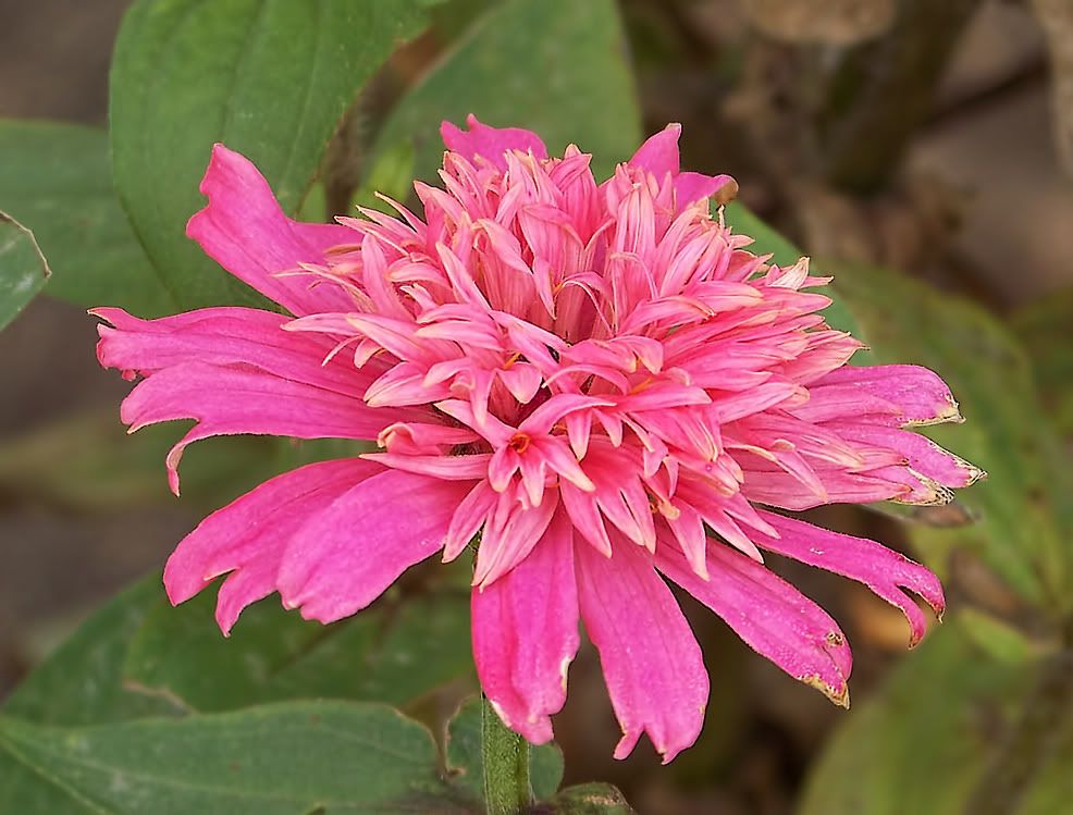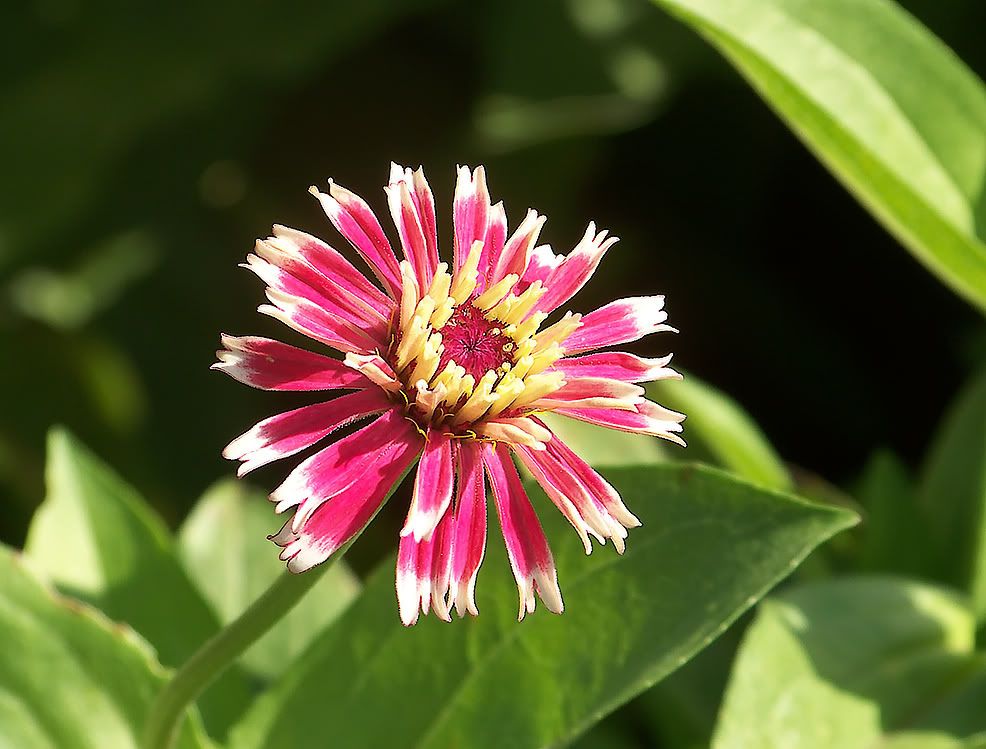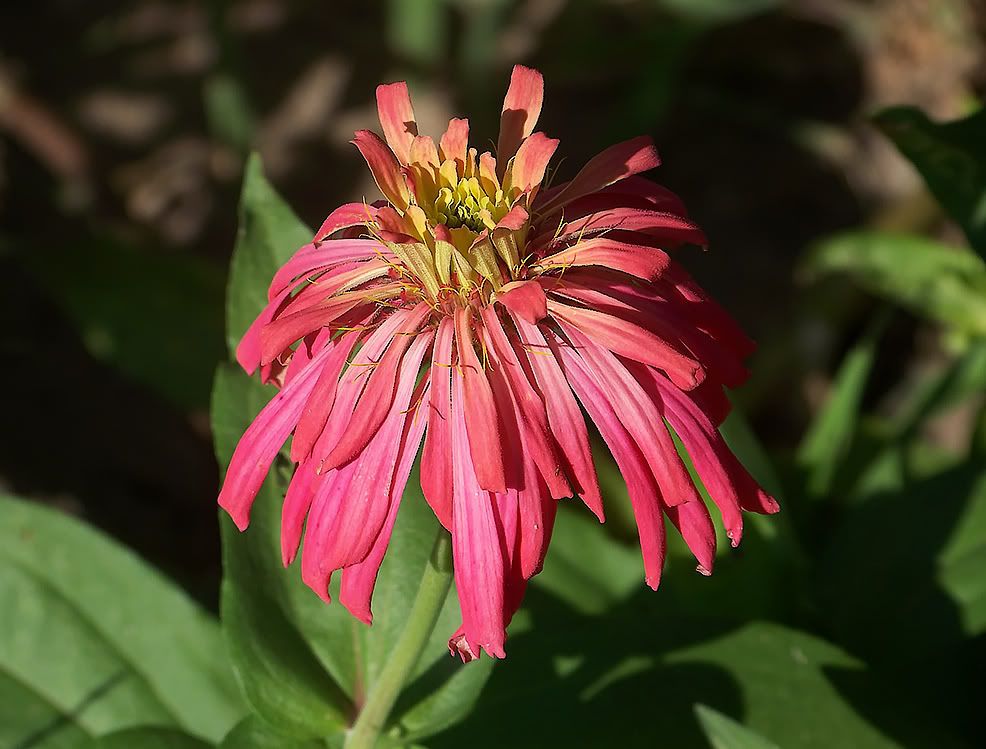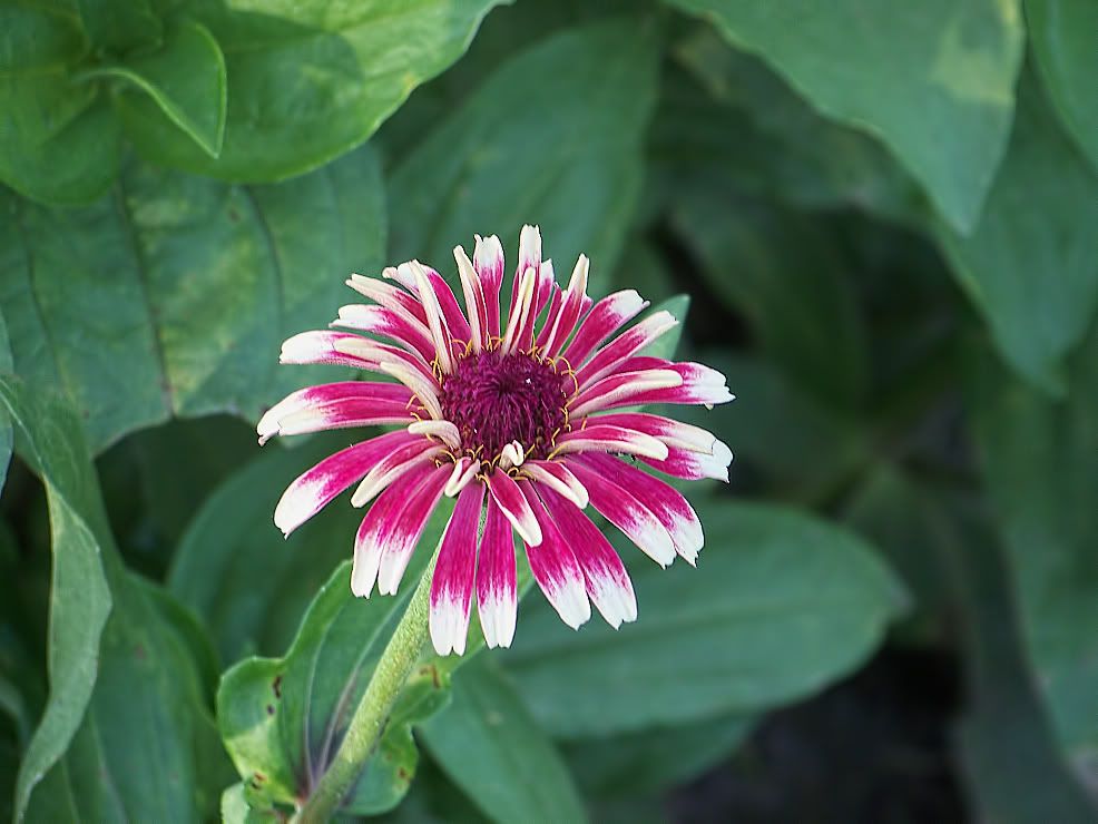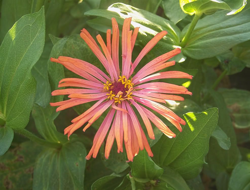 | ZM, I think the long, pointy leaves, are better, too, but I have very few plants with those! In fact, the Extreme Roll progeny have extremely "fat" leaves...flower buds are getting ready to open. With respect to leaves, I found a "Threesie" among some of my plants today. Also, I have noticed that pigmentation of the leaves at the nodes is often a purple tint, especially when the flowers are to be red or purple. I plant my zinnias so thickly that many rise to heighths of five feet or more! Here is the first of my Candy Mix (2009) F1, resulting from a random cross in the garden: