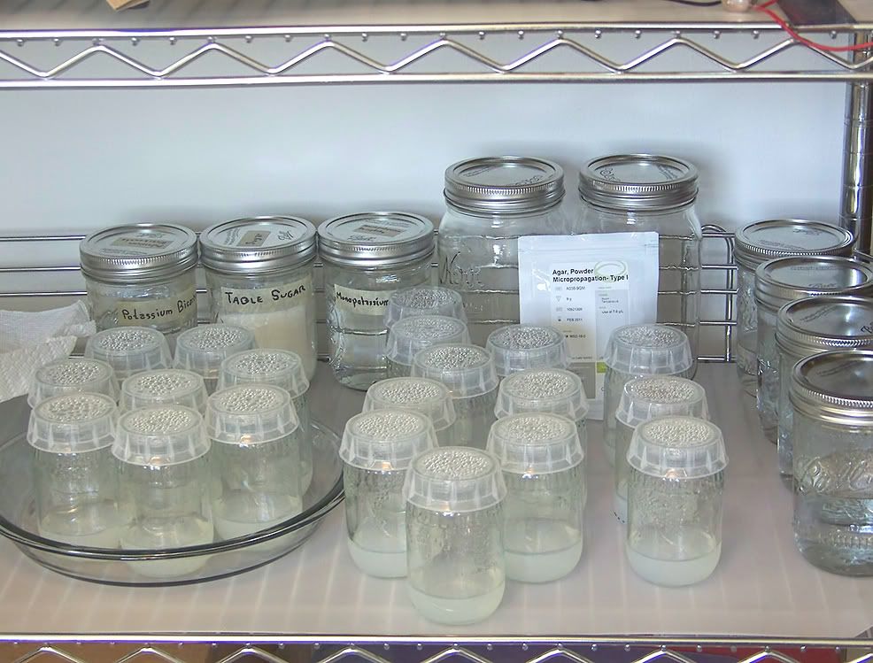 I used the conventional Murashige and Skoog (MS) formula for the medium with added sugar. Benzylaminopurine (BAP) was added as a plant growth hormone to stimulate shoot formation. (The strategy is: first the shoots, and then the roots.) I also included some PPM (a proprietary Plant Preservative Mixture) to help prevent fungal and bacterial contamination. This is all standard stuff in the commercial "Kitchen Culture Kit" for amateur hobbyist tissue culture.