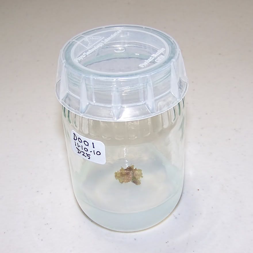 It doesn't show in the picture, but there are some greenish areas in that tissue. My next batch of BAP culture medium will contain a lot higher concentration of BAP. I also have a small amount of TDZ (Thidiazuron) and Kinetin to experiment with. I am a little skeptical about the Kinetin (some people have reported that it is a weak cytokinin). But I am a little more optimistic about the TDZ. We shall see what we shall see. |