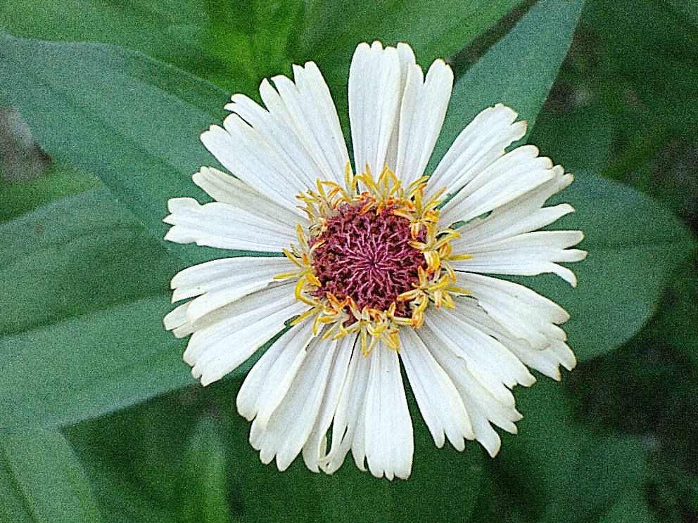 | Some of the toothiness appears in this F2 from the F1 hybrid above, but as with many F2s, there isn't an ideal combination of factors. This specimen is single. However, I have high hopes for lots more "toothiness" in good zinnias next year.