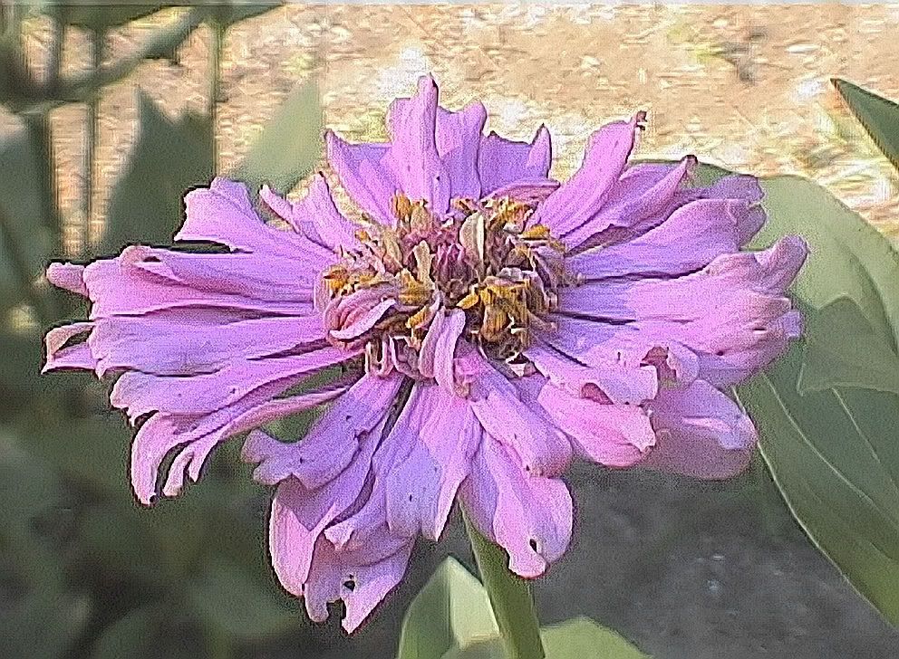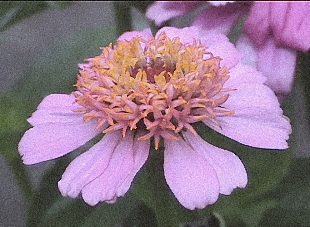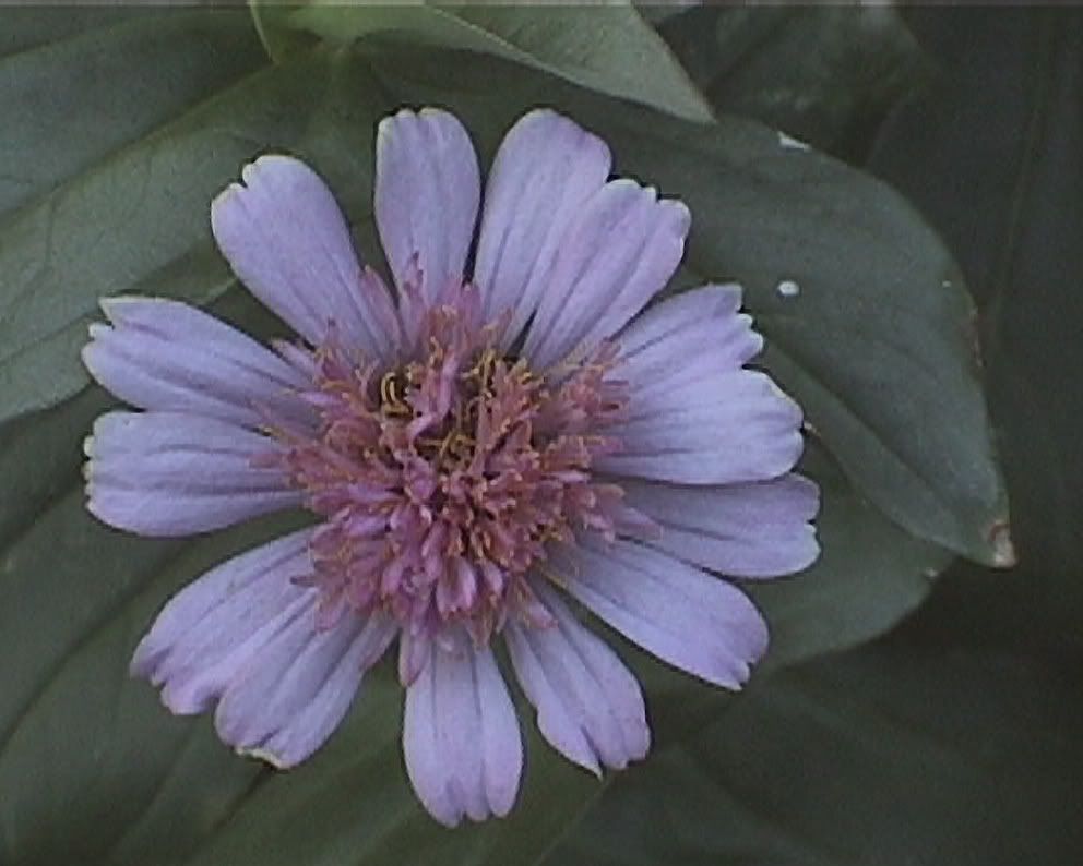 | JG, With 7 years of bee-crossing in your rich variety of zinnia varieties, you probably have a very rich, deep zinnia gene pool, with the potential for selecting out some great new strains or cultivars. The yellow-white bicolors sound like they would be well worth tagging and saving seed from separately. I thought I had a lot of zinnia seeds, but you have got me beat by a country mile. But that's a good thing. The more seed sources you use, the better chance you have for finding something new and unique. I have discovered that each field of seeds produces a different mix, even if the name of the variety is the same from one field to another. Your idea of getting more yellows to improve their representation in your gene pool is a good idea. Your yellow sources are good. I hope to select a few good yellows out of some of the mixtures that I grow a lot of for my spider flowered project. So a good yellow spider flowered zinnia will be something I am looking specifically for. I did have a good golden yellow this year that I used pollen from. My only canary yellow zinnia had an ordinary cactus flower form and the blooms weren't as large as I prefer, so I didn't use it as a breeder. But, as you have already noticed, yellow and white are zinnia colors that need special attention. "Then, probably, like everyone else, I think it would be neat to get a blue, or close-to-blue zinnia..let's give it a try..:-)." Once in Fort Worth I got a light powder blue that was stable in partial shade. Unfortunately a dog destroyed that plant before I could save any seeds from it. It had some green "Envy" blood in its heritage. This year I put heavy tomato cages made from concrete re-mesh wire around my more critical breeders as protection from just such mishaps, and there was some damage from some unknown animals (dogs, deer?) that ran through my zinnia patch at night. This is a picture of my "closest to blue" zinnia this year. The colors are un-retouched, and the picture is a bit underexposed because it was taken on a cloudy day. It was one of my echinacea flowered specimens. Since none of the many wild zinnia species has a blue, I think blue will be very difficult to achieve. But I always watch for it, just in case. MM
