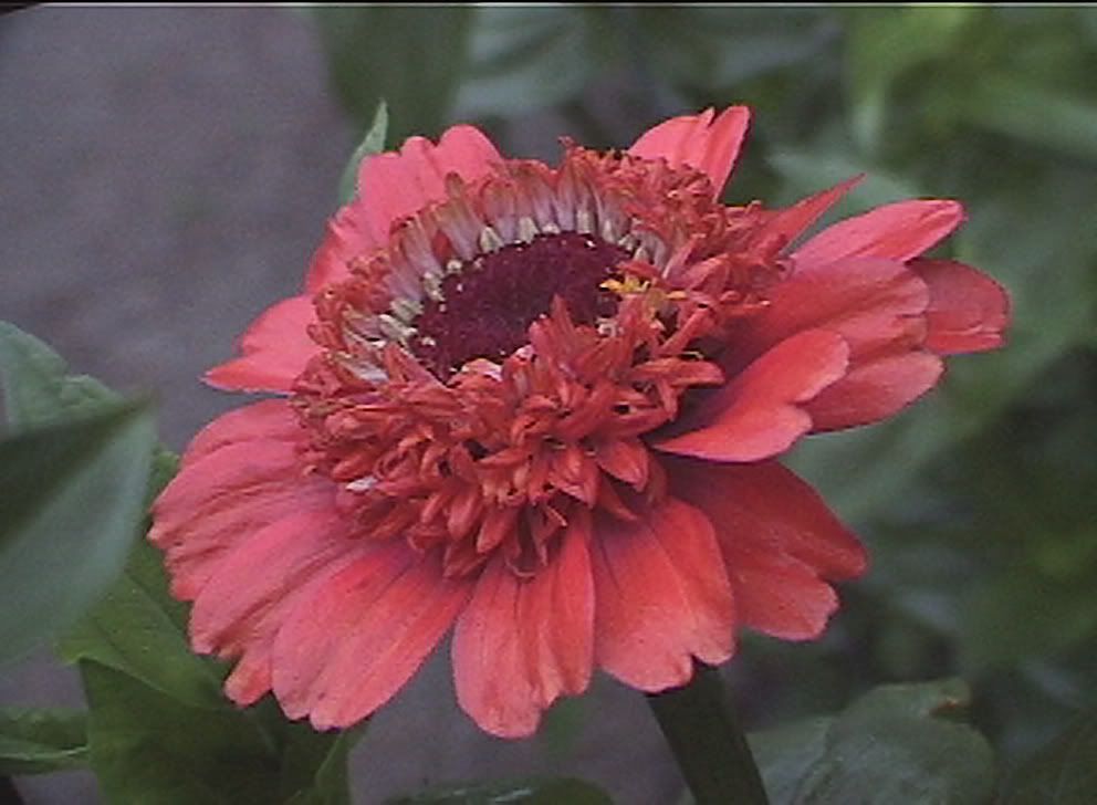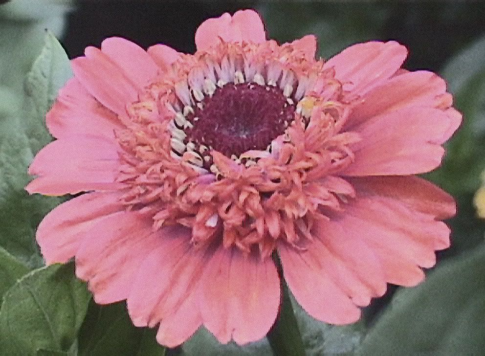 | This zinnia was a cross between an echinacea flowered F1 hybrid and a commercial Burpee Hybrid. It shows the scabiosa influence in the center.