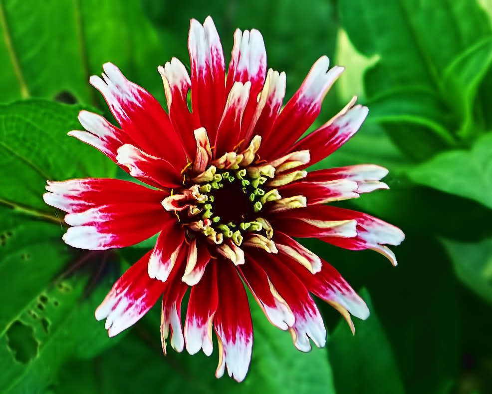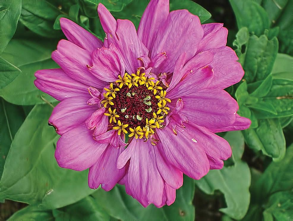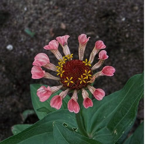 I usually consider single zinnias as culls. However, I can make an exception when a single zinnia appeals to me. I took this picture a few minutes ago of a single that reminds me a bit of the one in your picture, except the petals on this specimen are a little bit like small Pitcher Plants. Ironically, a tiny insect appears to be emerging from one of them. This zinnia is a recombinant from a hybrid between a descendent of my original trumpet-petaled mutant and one of my "regular" zinnias. I hope to get some better recombinations of the trumpet genes and other zinnia genes.