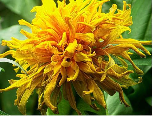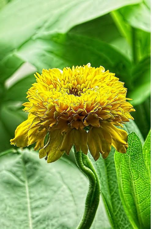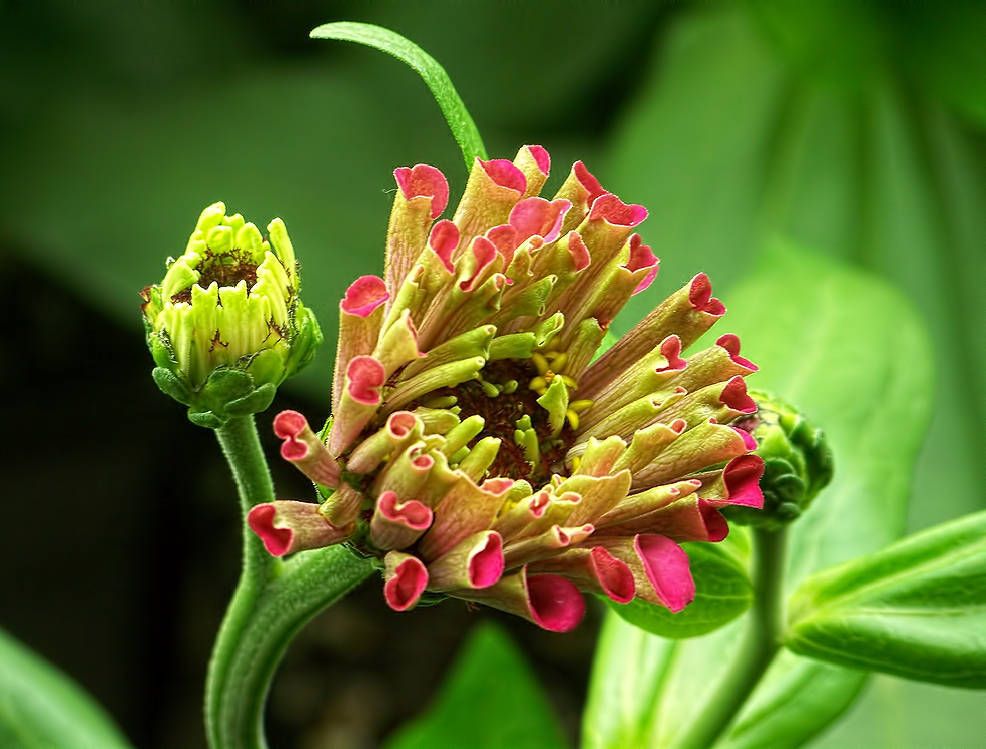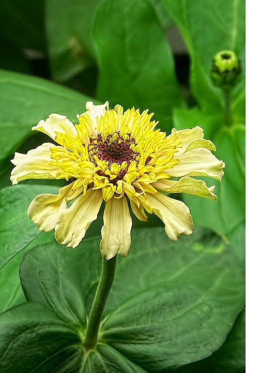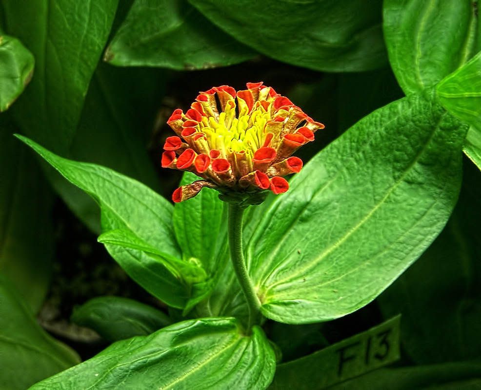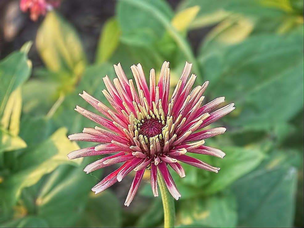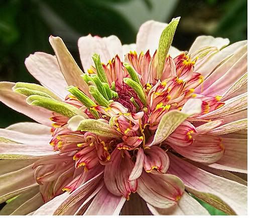 But I am keeping this one around because it has an unusual "look". The petals remind me a bit of pitcher plants. That little beetle peeking out of a pitcher petal confirms that this is not a carnivorous plant. I do wonder, though, if a variation of this flower form could develop nutrient absorption capabilities that could produce a carnivorous strain of zinnias. Admittedly, that would be a real "stretch". But zinnias continue to surprise me with their odd variations. |