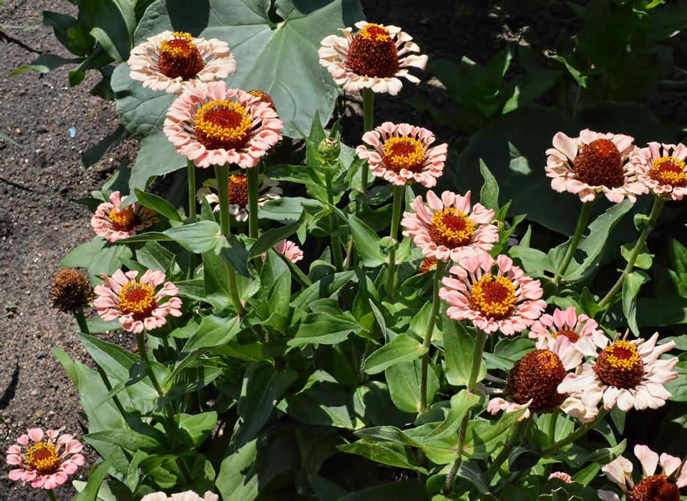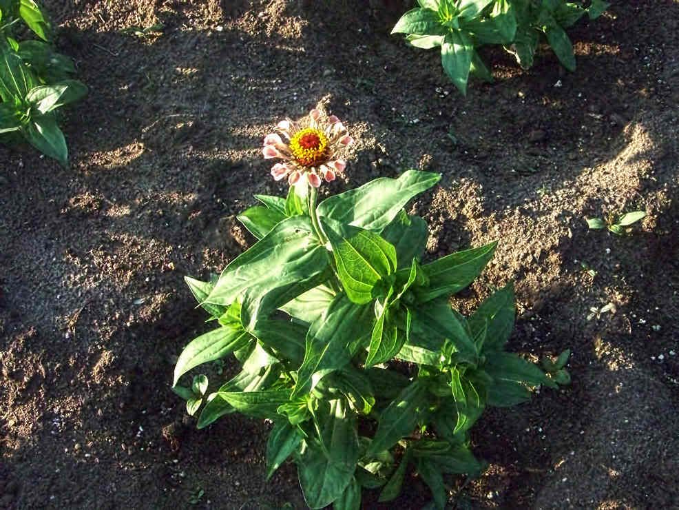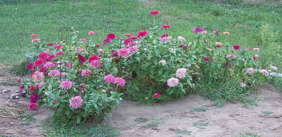 I did not pinch these plants, because I wanted to see what their flowers would look like as soon as possible. I want to cull them if I don't like their flowers. But, as you can see, zinnias tend to be bushy if they have room to grow and don't have to stretch to try to get more light. However, I agree with you. Pinching out the central growing point even before it forms a bud will give you much bushier zinnias. If you pinch the side branches, too, you get some really nice zinnia plants. In the interests of speeding up my zinnia breeding, I usually want to see the central flower as soon as possible. If I like the flower, I can remove it to get more flowers on side branches. If I don't like the flower, I can remove the plant to make more room for the other plants, and more room for me to get in to pollinate and cross-pollinate my zinnias. |
