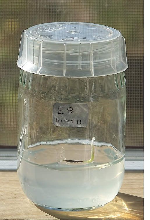 This control seed did not develop a mold colony, but it is obviously "not at home" in a TC babyfood jar. I think that is its root that is sticking up.