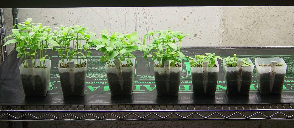 From left to right, the concentration of Physan 20 in the growing medium, in tablespoons Physan 20 per gallon, are 0 (the control), 1/4, 1/2, 1, 2, 4, and 8. As you can see, the concentrations of 2, 4, and 8 tablespoons per gallon are quite phytotoxic, and I expect the 4 and 8 seedlings to die in the next few days. The 8 seedlings are mostly dead now. |
