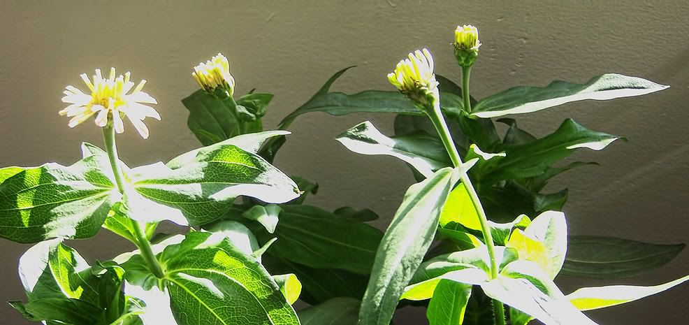 I took a few zinnia cuttings this Fall and they were pretty much wiped out by Spider Mites as soon as I got them inside. I wasn't expecting that or prepared for that. None of the insecticides I had on hand were effective against the spider mites. Actually Spider Mites aren't even insects, they are 8-legged mites and you need a miticide for them. I am going to purchase some stuff to deal with spider mites, because I assume I will continue to have problems with them. The systemic Imidacloprid that I have gives good protection from thrips and aphids, but was totally ineffective against the Spider Mites. The mites are going to be a challenge for me this Winter, and I will give ongoing reports about that. I see a zinnia seedling with no chlorophyll every now and then. I suppose I could keep one going by giving it foliar feedings that includes sugar, but I just consider it a lethal mutation and let nature take its course. There is a lot of genetic recombination going on in my zinnias, and I strongly suspect that some of my apparent good zinnias seeds that failed to germinate did so because of lethal genetic defects. More later. Keep us informed about your indoor zinnias. Zinnias are easy to grow outdoors, but growing them indoors involves a lot of possible problems. When you overcome those problems, you can have some satisfying results. ZM |