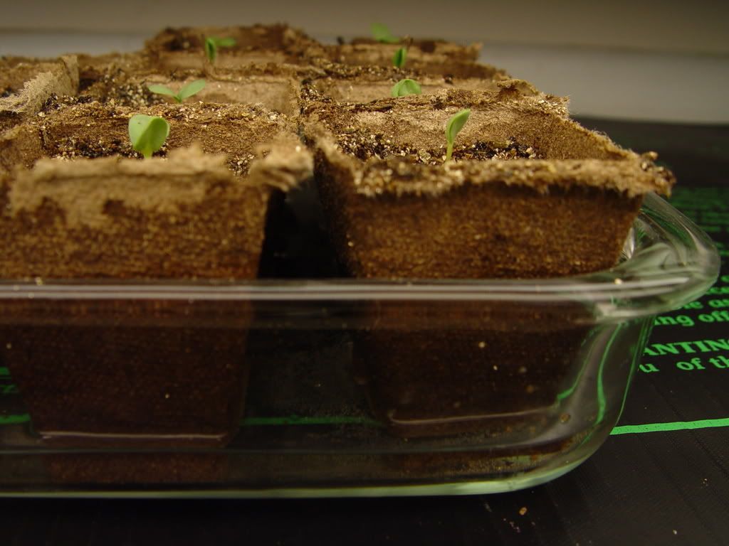 | Germination of seeds in the boxes on filter paper is fine-- but these guys have a poor sense of geotropism--they "want" to put their roots up in the air or in angles that doesn't lead them to moisture--not good! So, things are going to be changed a bit in getting them started..to be reported on within the next few days. I rescued these little ones that lost their way, and they are in peat pots now. As of now, lights are about 1/2 inch above boxes and about 1 inch above seedlings in peat pots. Temperature one inch below lights is 88 degrees F; temperature in peat pot soil is 77 degrees F; temperature of liquid medium in boxes is 86 degrees; temperature of filter paper about 84 degrees F. All are placed on a heating mat that does not have a control for temperature, but the manufacturer estimates that it warms materials placed on it about ten (to twenty) degrees above ambient.....The room temperature is about 68 degrees F, and there is heat coming from the lights, so that seems to be consistent...more later.... |