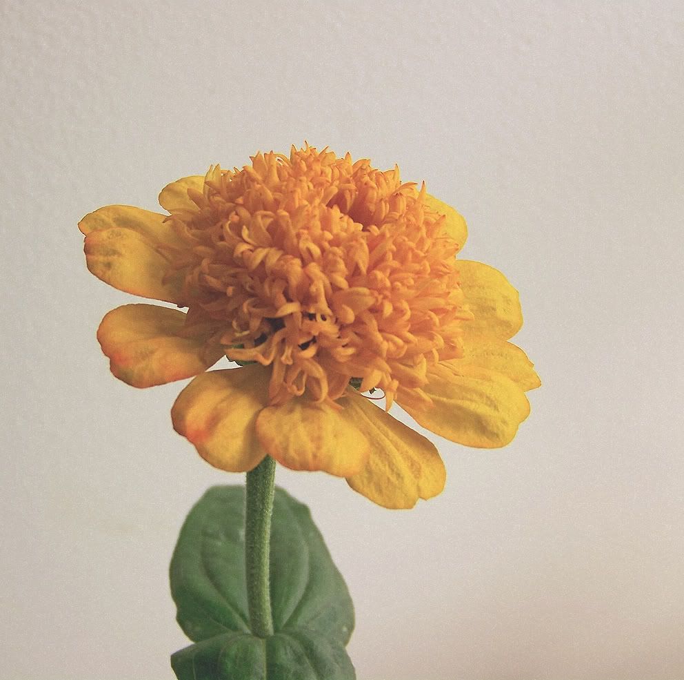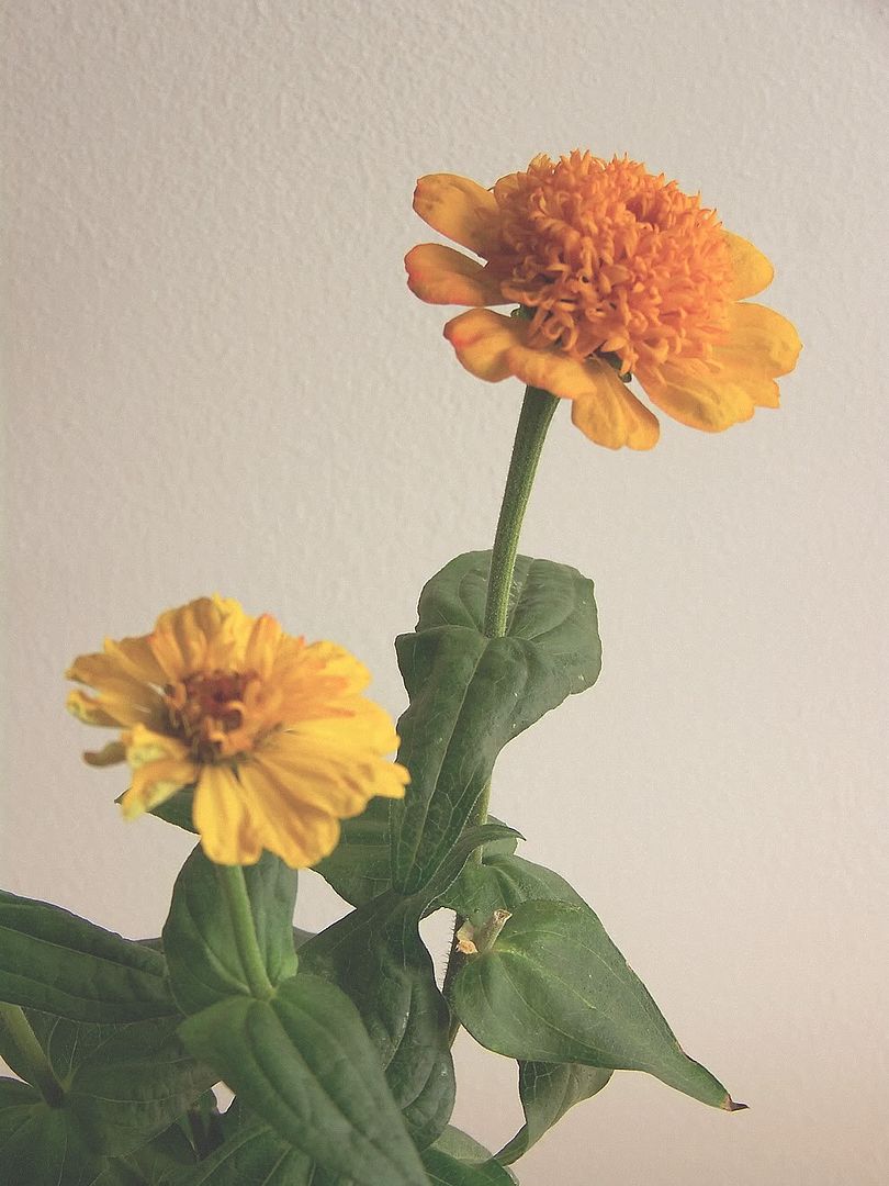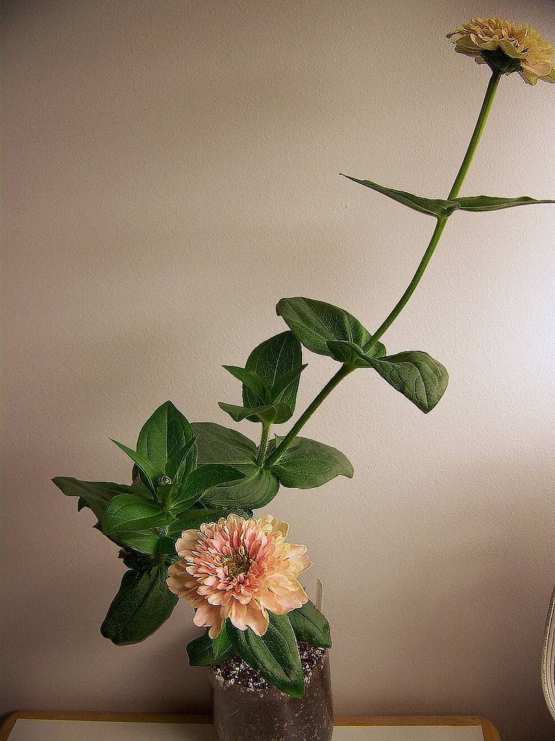 | JG, I guess I should have said later this month. My zinnia cuttings have had a chance to grow into plants and some of them are blooming. I have mentioned before that some zinnia plants seem to vary somewhat from branch-to-branch and that makes me wonder if a zinnia plant is genetically uniform. This marigold flowered cutting-plant zinnia is a case in point. The lower flower has a distinct pinkish color, while the upper flower is a cream-yellow color.