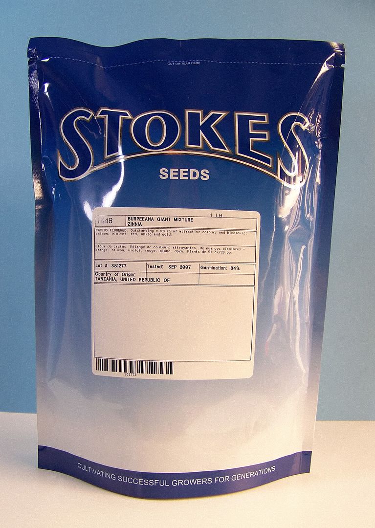 (A Velcro band with a breeder code is partially visible on its stem.) I want to improve on that flower form to make it much more spider flowered, and to do that I need to grow a lot of cactus flowered zinnias and select for still longer and more narrow down-rolled petals. I want a zinnia strain that rivals the spider flowered chrysanthemums. And, as a sub-strain, I want to get bicolored and tricolored spider flowered zinnias. I think the offer has expired now, but Stokes recently offered free shipping on orders over $50, so I purchased one pound of their Burpeeana Giant Mixture. This is a picture of the "packet" it came in. (Notice the country of origin.)