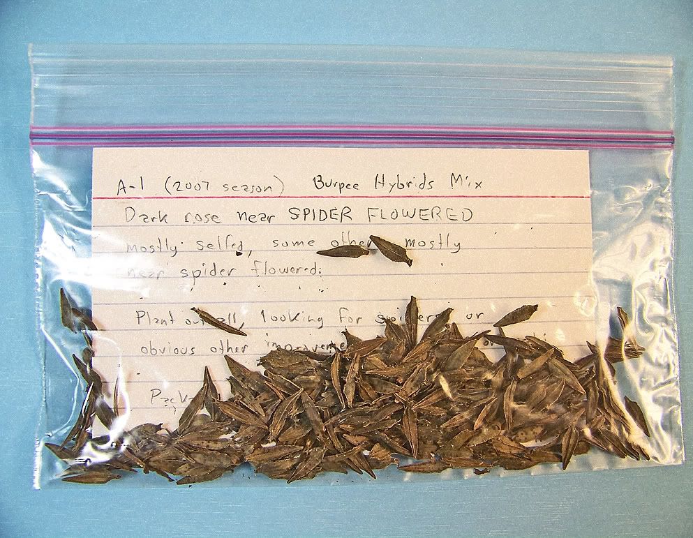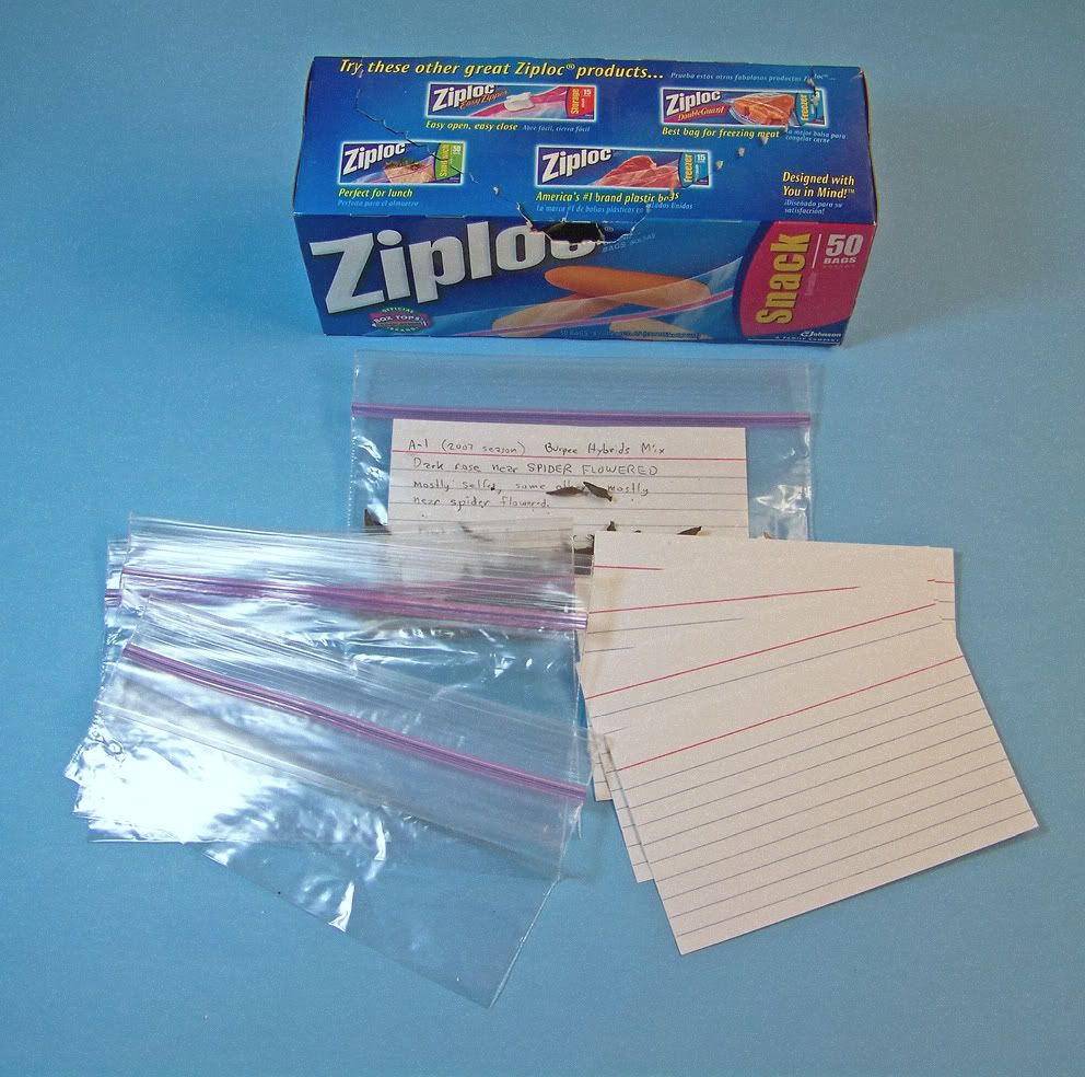 I find that 3x5 cards and Ziploc® Snack bags are a good team for packaging most of my seeds. The seeds should be dry before packaging them in the Ziploc bags, because the bags are relatively waterproof.