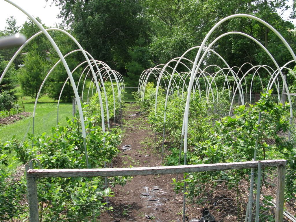 | I use individual blueberry bushes in my landscape so covering them can be challenging. I am attaching a few pictures of what we call the "bird globe". Made with 1/2" PVC tubing and 6 T-connectors. Make sure the connectors angle out away from the base of the plant at a 45 degree angle to give it it's round shape. Yeah, it looks stupid but only needs to be in place for about a month or so. Without it, robins would have me cleaned out in one day. It is held down with T-bar stakes. It is easy to turn the stake and remove it for picking. I store them under my deck when not in use. So far has kept all birds out. However they do perch on it sometimes and leave their droppings on my berries. Need to add some spikes to the top.